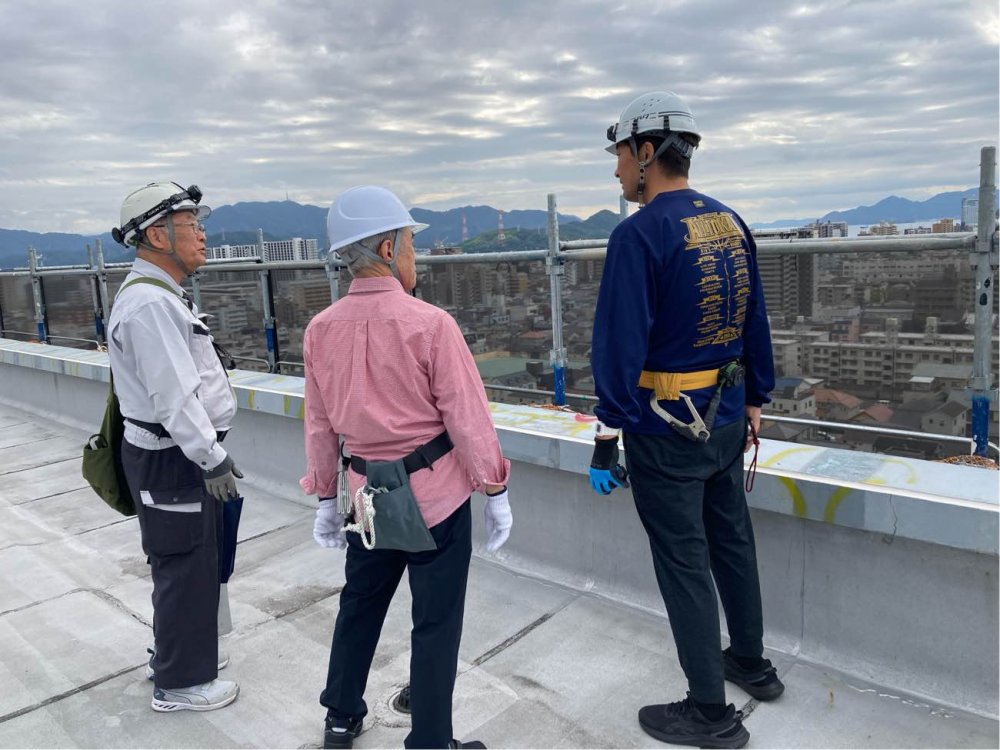 広島市内で進行中の分譲マンション大規模修繕工事では、工事の品質確保と現場の安全管理を最優先に、計画に基づいた作業を進めています。 大柿産業グループでは、定期的に「安全衛生パトロール」を実施し、作業環境や安全対策が適切に保たれているかを確認しています。また、このたびマンションの代表者様および工事管理者様とともに外壁補修検査を行い、補修状況や仕上がりを丁寧に確認しました。 現場スタッフとの意見交換を通じて改善点を共有し、より確実で安全な施工体制づくりにも取り組んでいます。 今後も安全・安心な施工を徹底し、居住者の皆さまにご満足いただける修繕工事を目指してまいります。