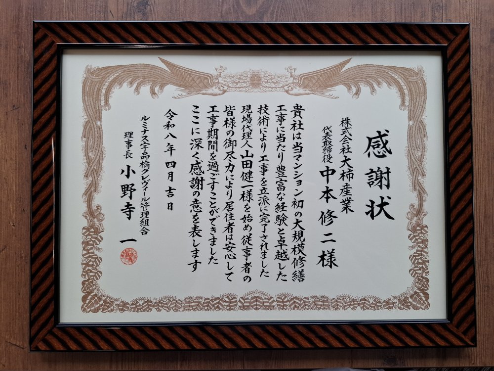 このたび、当社が携わらせていただきましたマンション大規模修繕工事において、管理組合様より感謝状を頂戴いたしました。